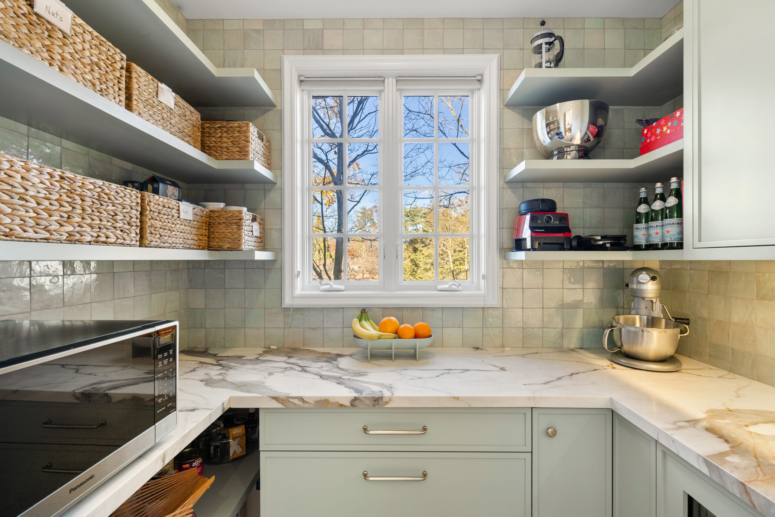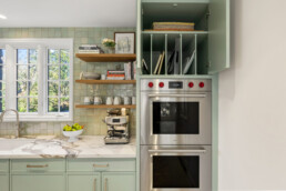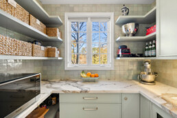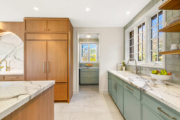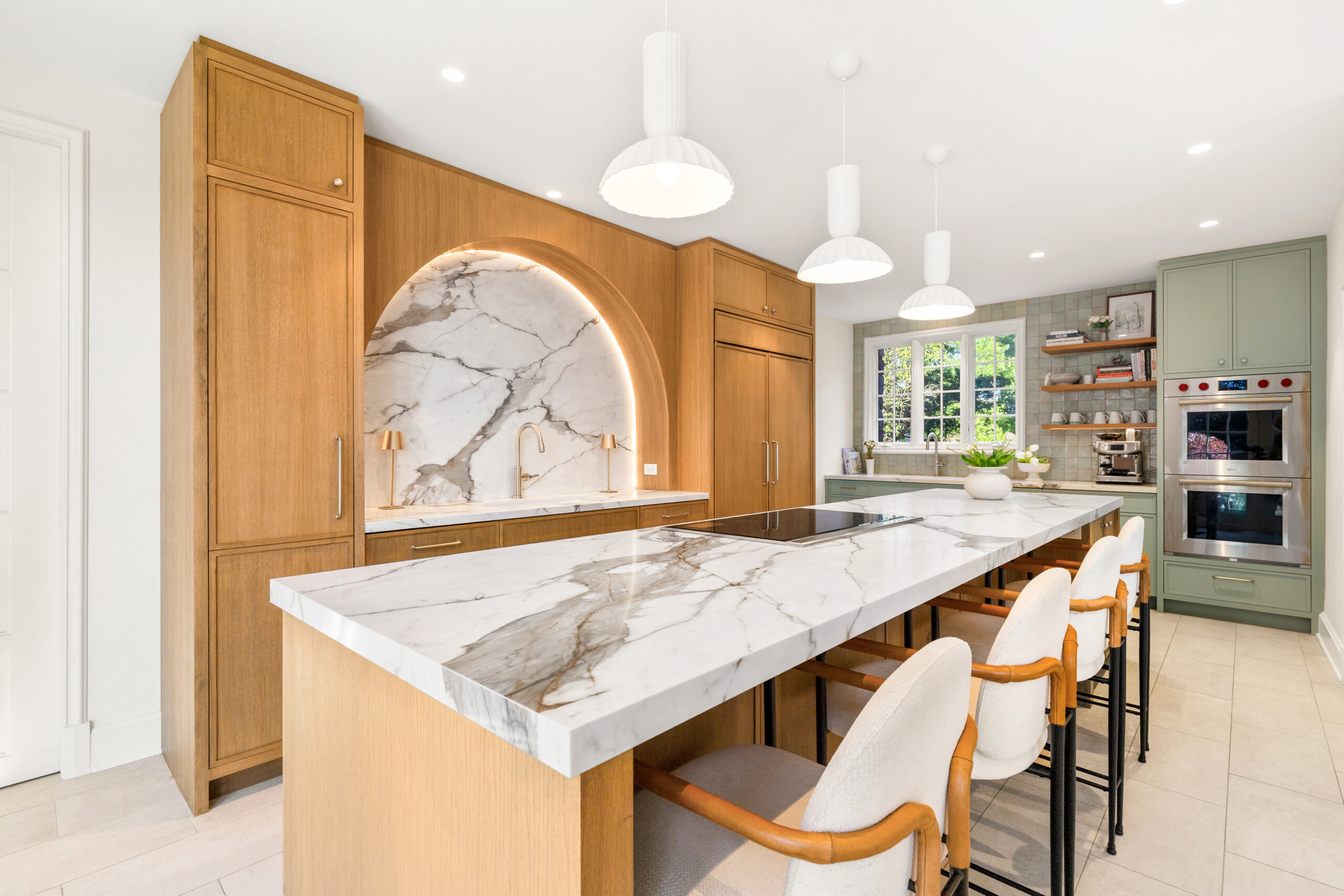 This modern kitchen was designed as a refined yet welcoming gathering space, anchored by a sculptural marble arch that frames the sink and serves as the focal point of the room. Warm wood cabinetry and soft green millwork create contrast and depth, while full-height marble surfaces bring a sense of quiet luxury. A generous breakfast bar with integrated seating encourages everyday connection, seamlessly blending prep, dining, and entertaining. Thoughtfully designed storage—including a fully outfitted pantry—keeps the space highly functional while preserving clean lines and visual calm. The result is a kitchen that balances architectural impact with effortless livability.